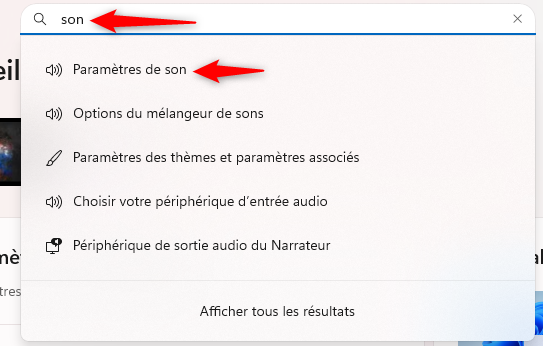 Dans la barre de recherche tout en haut, taper son et choisir Paramètres de son