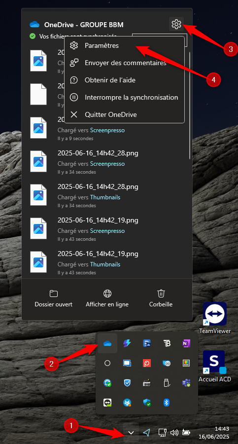 1. Cliquez sur le logo OneDrive dans votre barre des tâches puis cliquez sur la "roue dentée" puis sur "Paramètres"