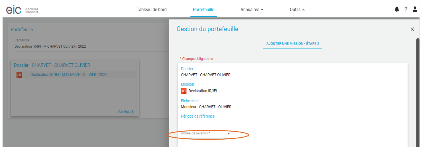 Puis sur le volet déroulant « Année de revenus* », sélectionnez « 2023 », puis « Valider ».