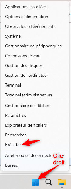 Pour ce faire, faire un clic droit sur le logo de Microsoft, et choisir Exécuter