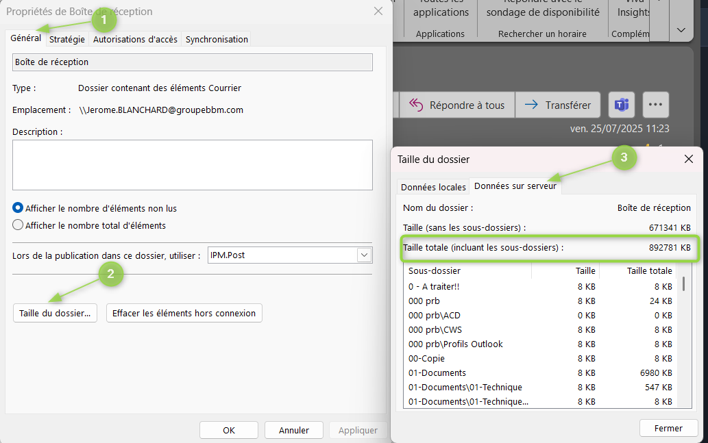 Avant d'exécuter la procédure regardons l'espace occupé par votre messagerie afin de mesurer le gain de place.