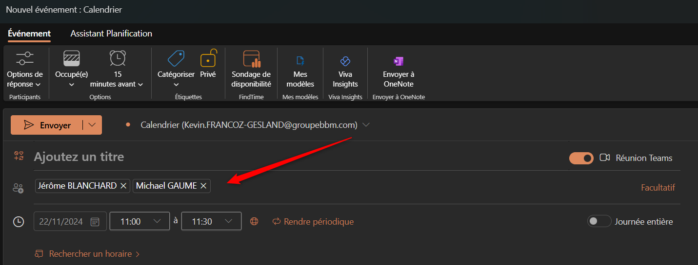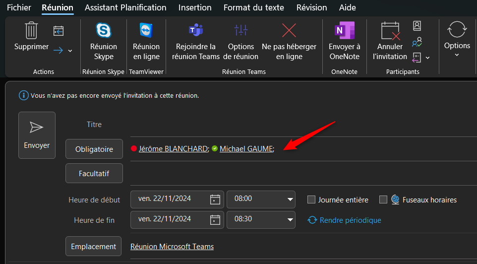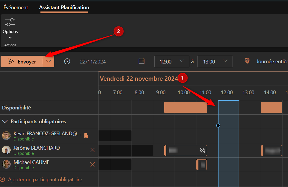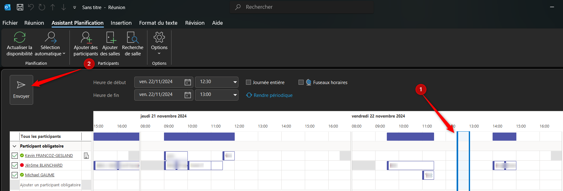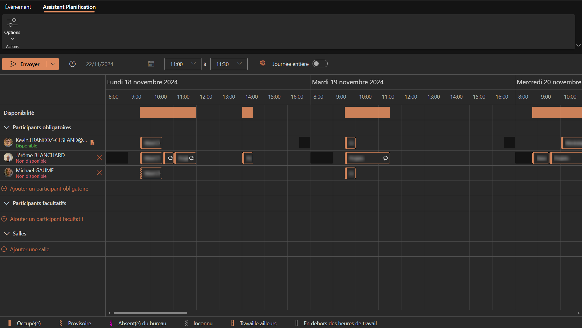 Outlook intègre une fonctionnalité qui permet de voir les disponibilités de plusieurs personnes dans le but de planifier une réunion.