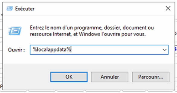 Dans la fenêtre qui s'est ouverte saisissez %localappdata% puis faites OK